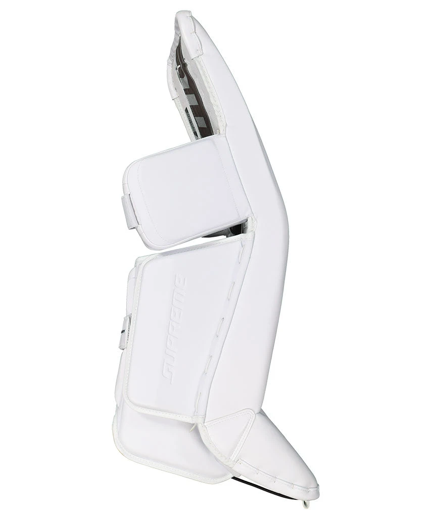 The Ultrasonic Goal Pad is made for the elite goalie. The Ultrasonic features our newest innovation, Stabilislide Knee Block, which prevents under and over–rotation to provide the goalie with a perfect ice seal. Thatβs only one part of how weβve re–engineered the butterfly. We have a new 151 Degree shocklite Core which gives the pad a better overall shape AND better position on the leg. Itβs reinforced with Curv to add to the seal, and a Butterfly Assist calf pillow which works with a new calf plate to enhance the seal. Weβve evolved our Tune fit strapping, it now features a connect strap that adds stability below the knee, which is removable if the goalie prefers to play without it. Finally, a Connect Flex 125 degree boot, which is our traditional Supreme angle, now offers a more flexible game–ready feel.