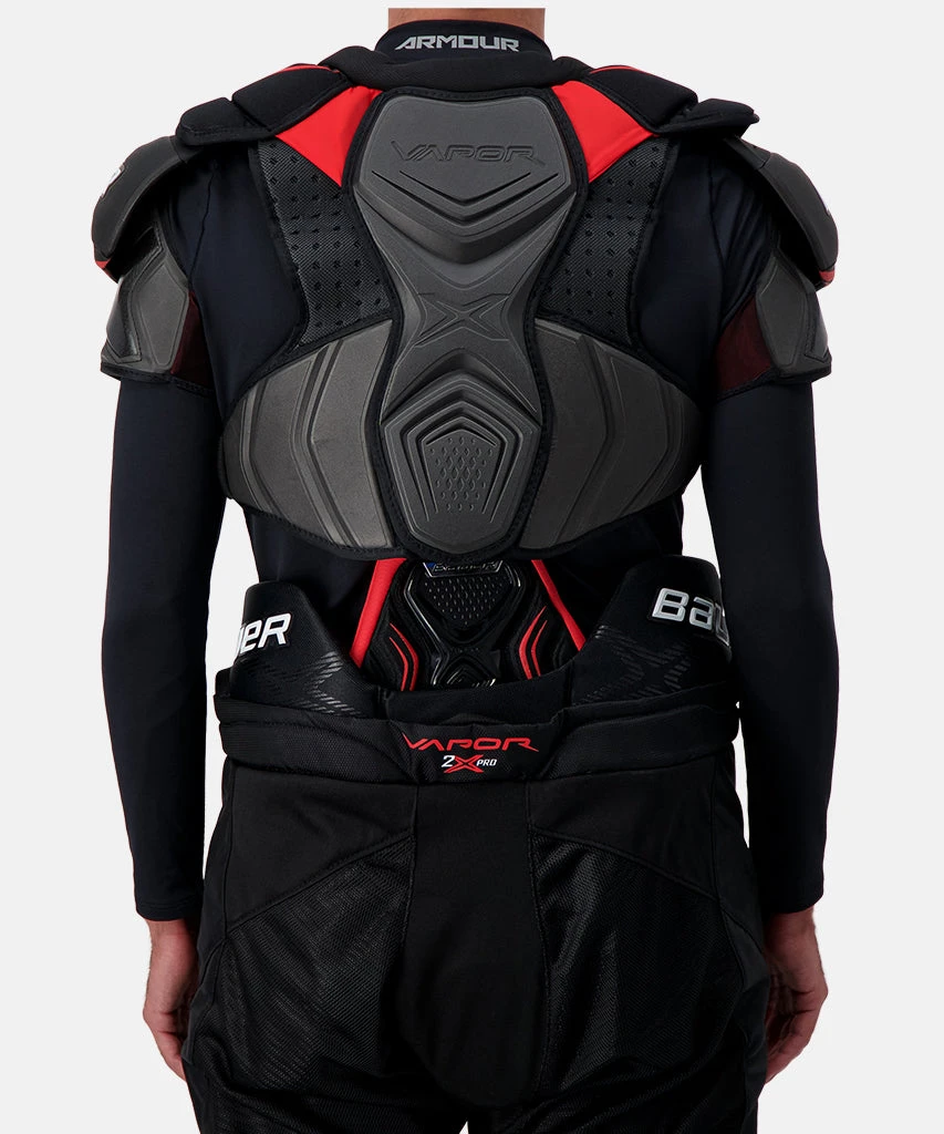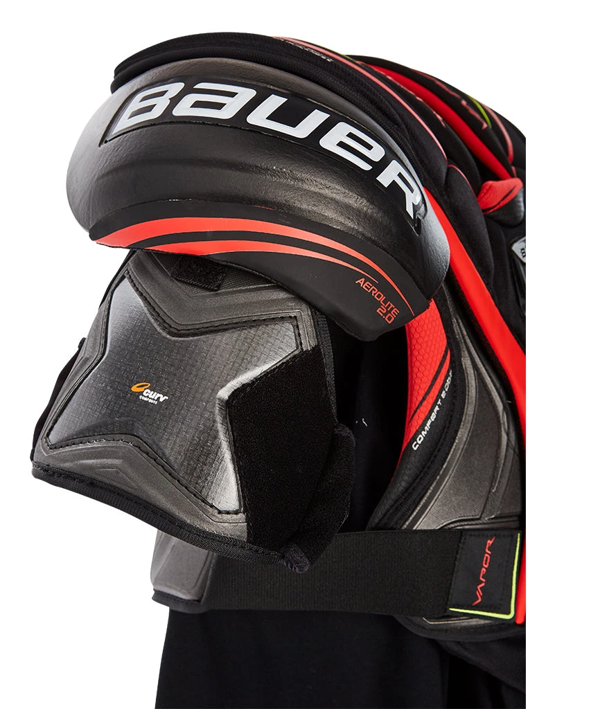 The Vapor 2X PRO Shoulder Pad is made for the elite level player.The first time you pick it up, youβll feel how light it is. Itβs the lightest elite level shoulder pad on the market,because it uses exclusive AEROLITE 2.0 caps with Curv composite and HYPERLITE foam. COMFORTEDGE and SLEEVE FIT biceps smooth out movements while the patterns have been refined to move with the body. They definitely give the player a comfort advantage on the ice. It offers incredible protection with an X–LITE SHIELD floating sternum which provides maximum impact protection AND full movement at the same time. A Thermocore Liner is designed to keep the player dry and handle odor control.