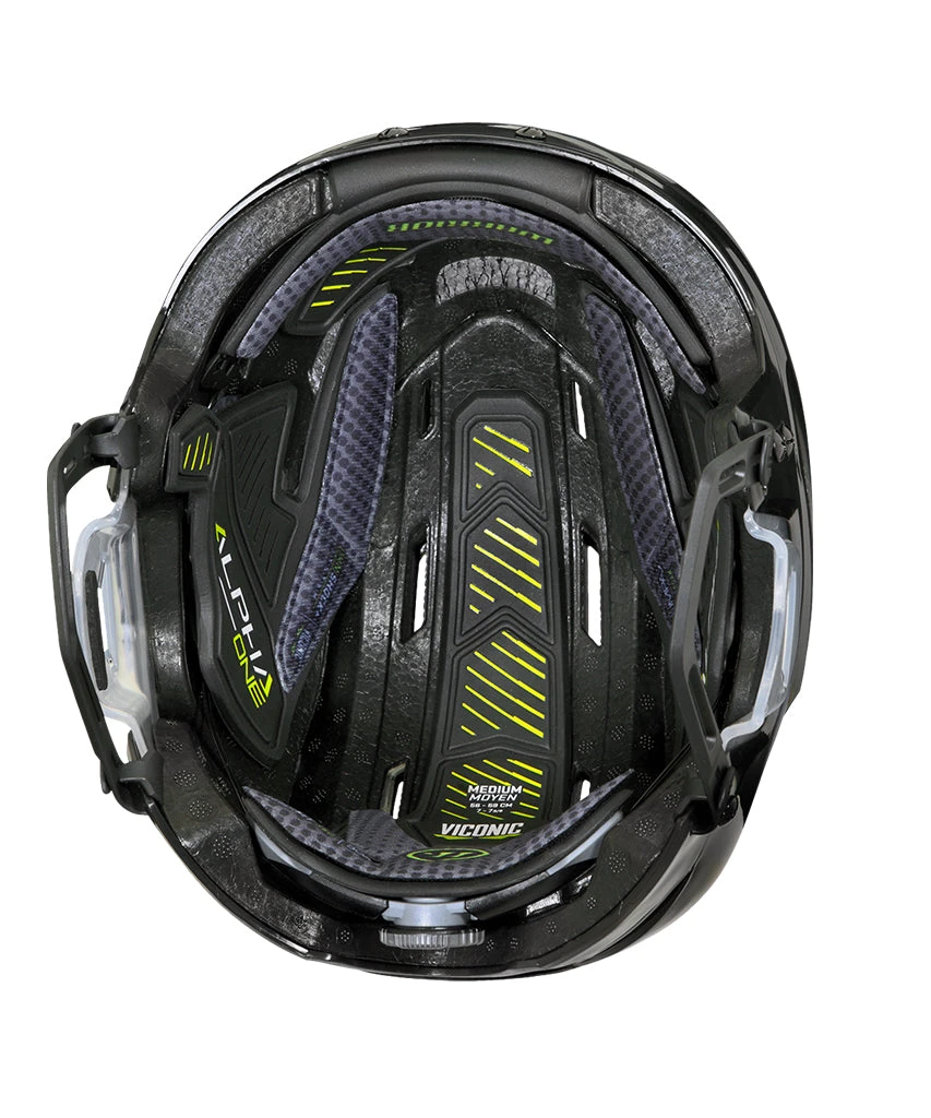 OMNISHOCK + PROTECTION SYSTEM W/ VICONIC INSERTS: All holistic approach to head protection focused on safety first. A shell and liner compositions are integrated by design. Focused impact zones on the frontal lobe, temples and occipital are enhanced with a lightweight diffusion plate called Viconic. Viconic absorbs multiple impacts both linear and twisting. The diffusion of force through the helmet is not one materials full responsibility. The TrueOne shell and EPP is the core of safety forming a lightweight barrier that provides protection against catastrophic injury. The Impax soft touch foam shield and the Viconic pods are special elements designed for specific small and large impacts. The Omnishock+ system is enhanced hockey helmet design.
